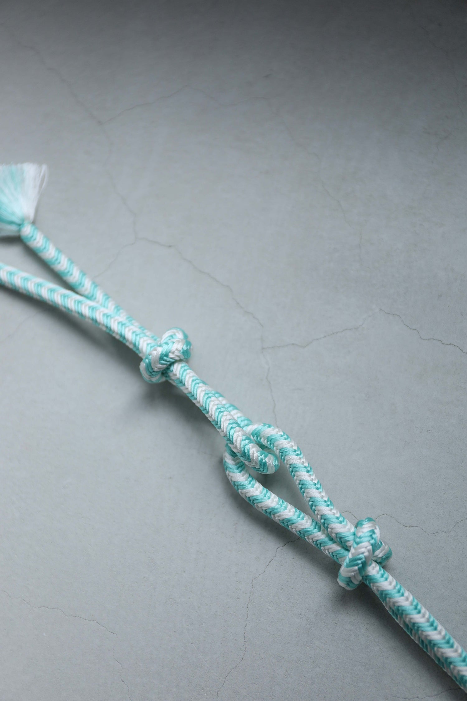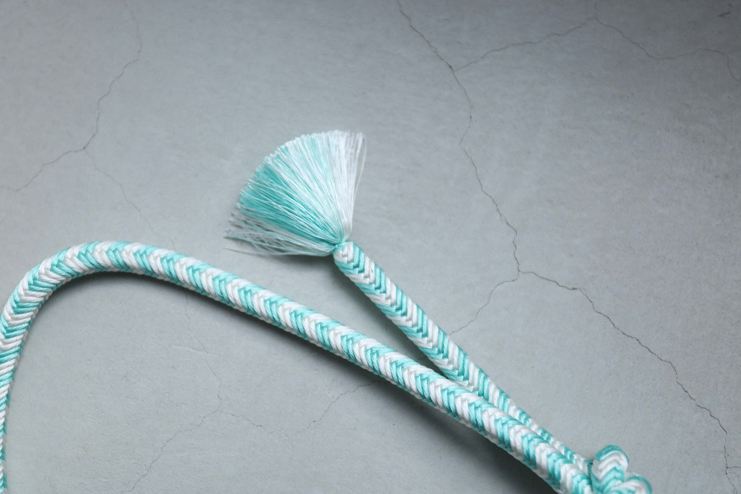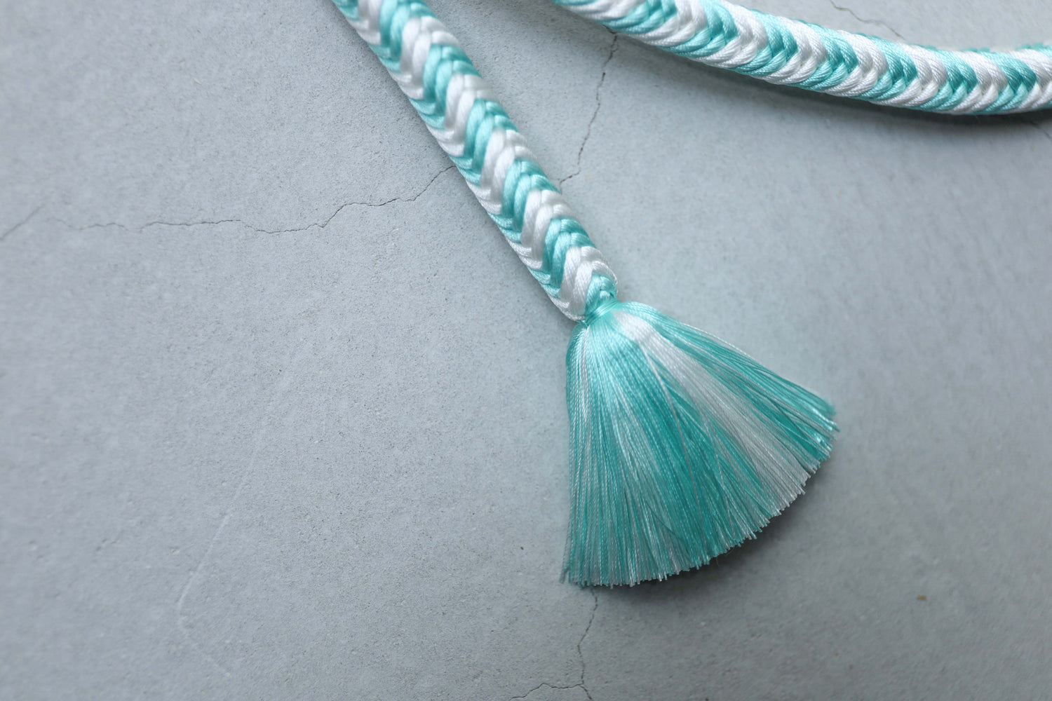ソーダのように鮮やかな水浅葱と、冷たいアイスのような白。結びやすい奈良組の技法で組まれたこの組紐ベルトは、締めるたびにスパイラルのように気分をぐんぐん上げてくれる、楽しくはじけたいときのための一本です。